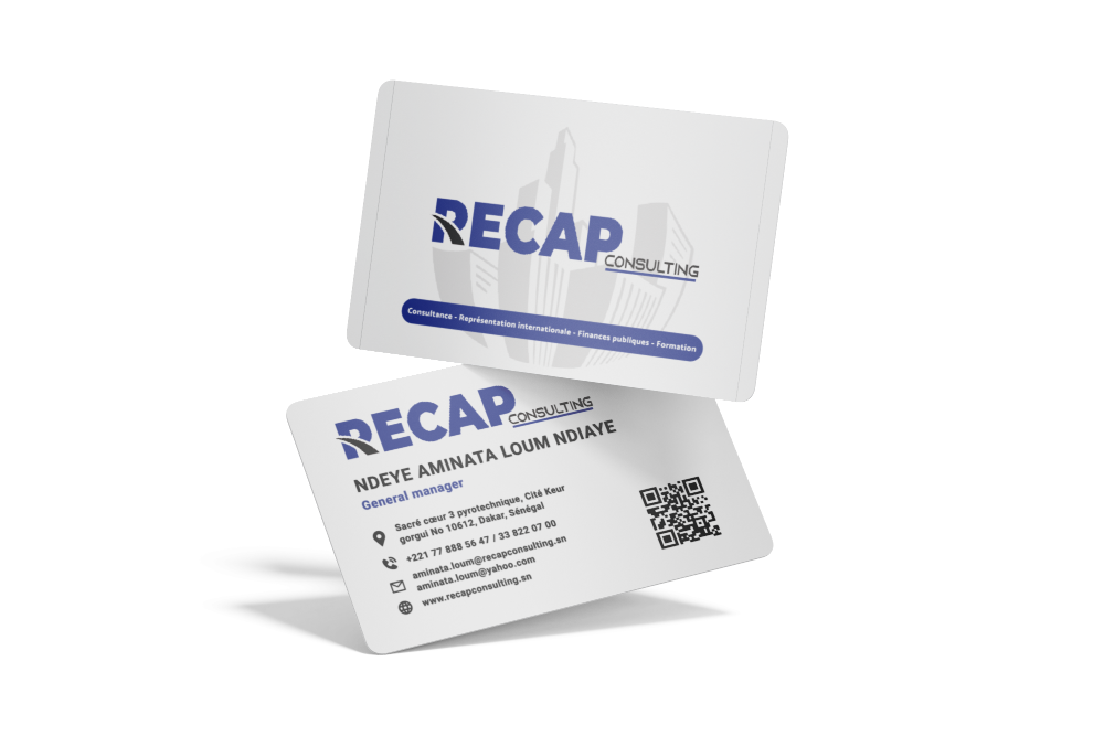 La carte de visite de Recap Consulting, cabinet de représentation internationale basé au Sénégal, présente un design soigné et professionnel….