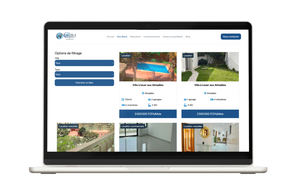 Le site de Dakar Relocation and Services Immo (DRSI) met en avant son expertise immobilière à Dakar, proposant des biens variés et des services de relocalisation pour expatriés. L’interface fluide inclut un formulaire de contact et une messagerie WhatsApp pour faciliter la communication rapide.
