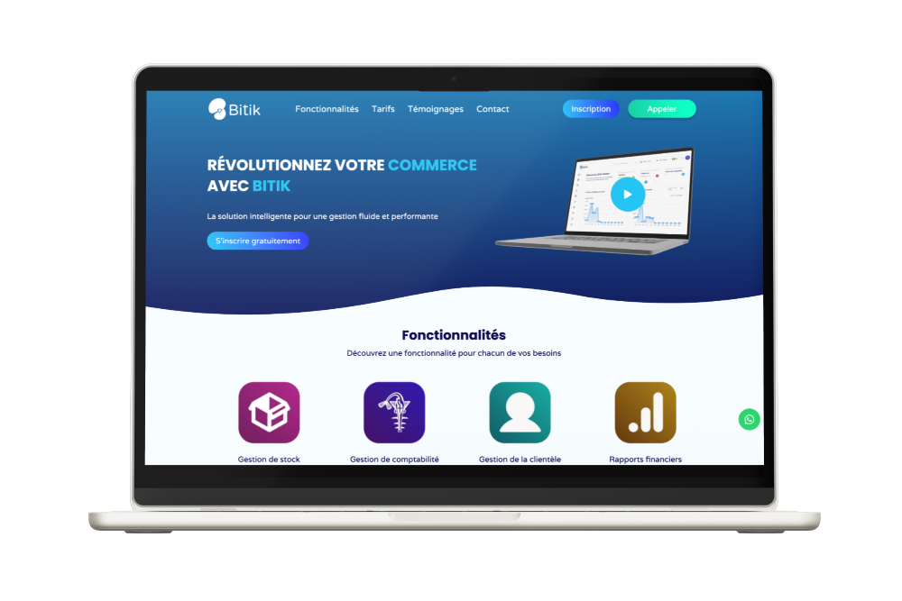 Le site de Bitik promeut une solution intelligente pour une gestion performante des commerces. Avec une interface simple, il permet aux utilisateurs de s’inscrire gratuitement et de demander des démonstrations. Un module WhatsApp intégré renforce l’accessibilité et le support client.