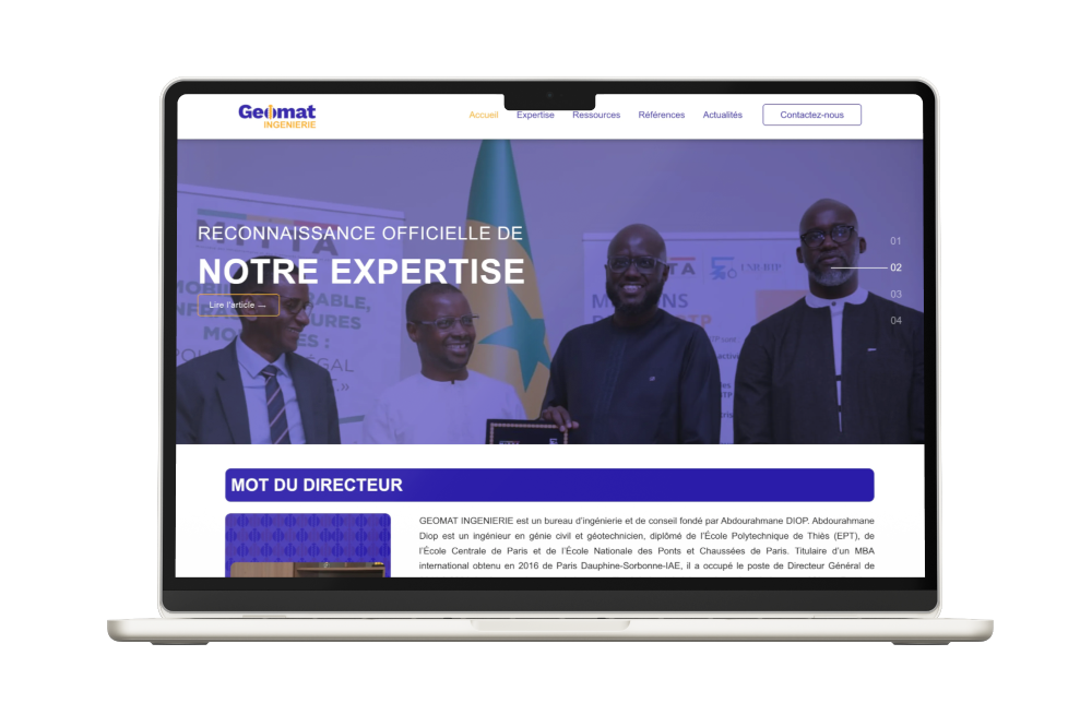 Le site web de GEOMAT INGENIERIE, a été conçu pour présenter le bureau d’ingénierie et de conseil. Ce projet met en avant son expertise en génie civil et géotechnique à travers une interface moderne et intuitive. Le site reflète son engagement dans l’ingénierie en Afrique, en présentant ses réalisations et contributions au secteur.